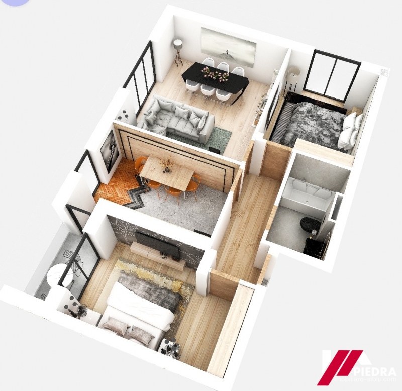 Apartamentele sunt decomandate si sunt formate din living unit cu bucataria (31.17m) -la etajul 1 livingul este separat de bucatarie, la etajul 2 este unit cu bucataria, hol (5.48m) , baie ( 4.71m) , 2 dormitoare ( 12.44m si 10.98m) si balcon (3.02m) .